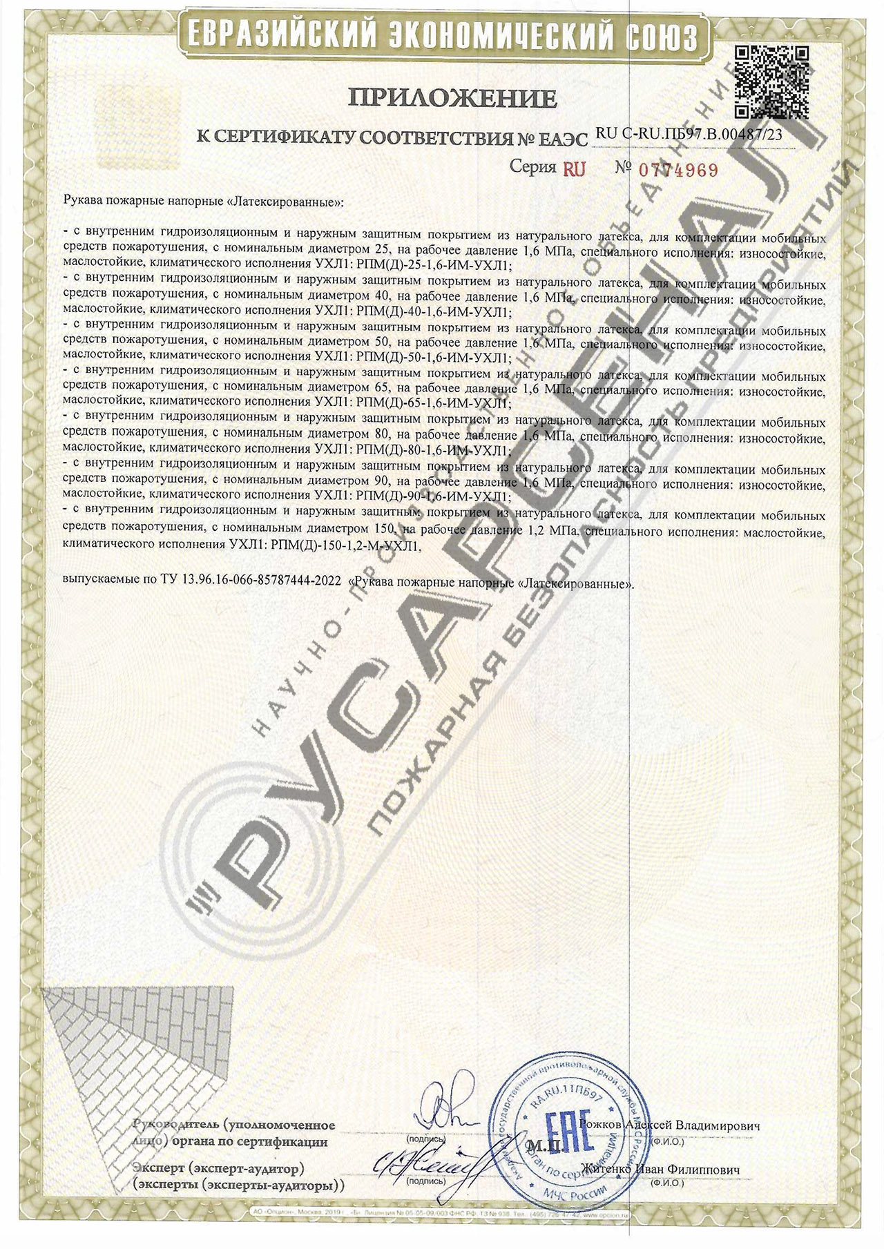 К каждому пожарному рукаву прилагается паспорт изделия. Сертификаты соответствия и приложения доступны для скачивания в разделе «Сертификаты» на этой странице.